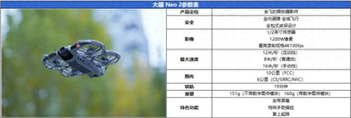 大疆Neo2的飞行速度可达16米/秒,但是在此挡位下避障系统不会工作,故建议小心使用。