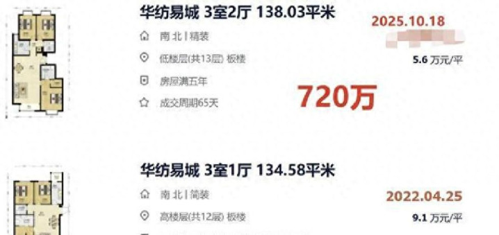 今年10月18号,136平米的楼层中间户型,卖家咬牙认亏,720万成交。转头一看,半个月前,同小区134平同类型房源刚成交750万。刚挂牌还在考虑的买家,估计还在琢磨下手不下手,结果直接“被降价”送走了。