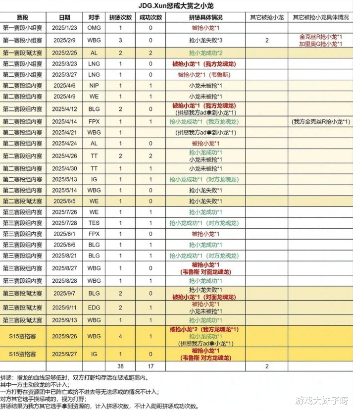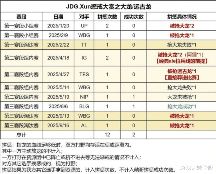 比赛结束后,众多粉丝与分析师将矛头指向了JDG的打野选手Xun,认为他的发挥成为了关键短板,在数据层面,网友整理出的拼惩表现尤其扎眼,据统计,Xun在本赛季的远古龙拼惩中被抢的概率高达100%,而在大龙争夺中同样屡次失手。