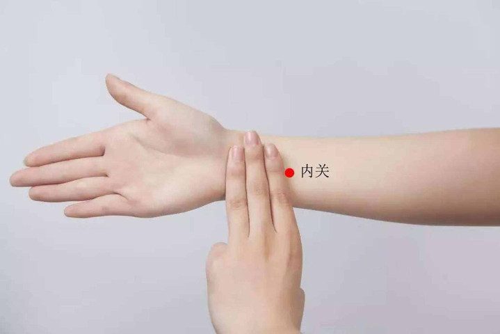 接着按揉内关穴1分钟,配合缓慢深呼吸,感受胸口的紧绷感慢慢消失;