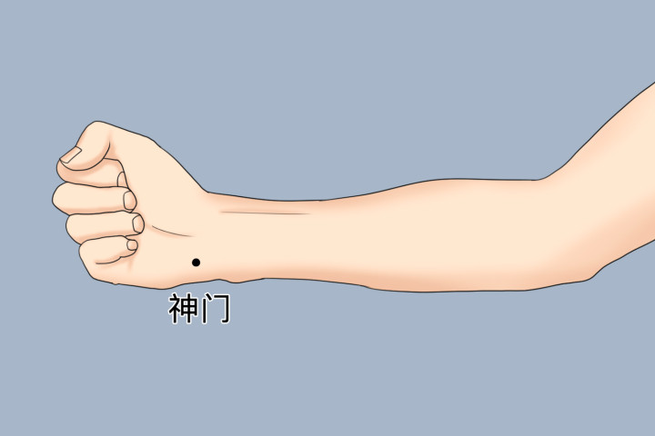 先搓热双手,用拇指指腹按揉神门穴1分钟,力度以酸胀感透进去为宜;